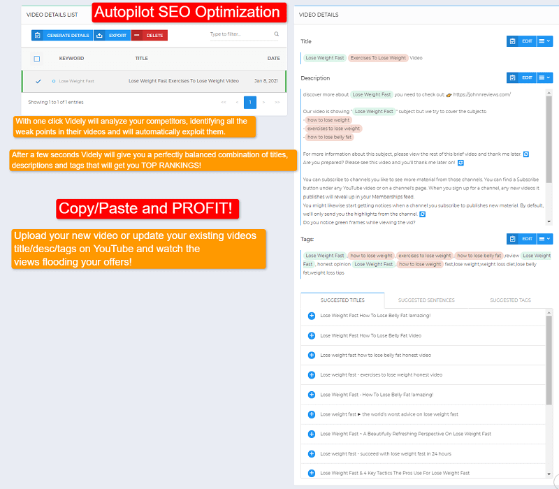With just a click, Videly will analyze your competitors and identify their weak points. After a few seconds, it will share a balanced combination of description, tags, and description that will get you top rankings.